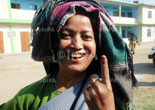 A Women with traditional dress shows her finger marks after casting her vote for the Meghalaya state election 2013 at Barnihaat under Ri Bhoi district Meghalaya on Saturday 23rd February 2013.Photo: DASARATH DEKA