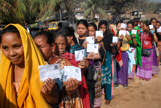 Women voters queue to cast their vote for the Meghalaya state election 2013 at Harlibagan ,Meghalaya on Saturday 23rd February 2013.Photo: DASARATH DEKA
