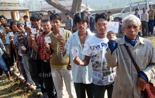 Voters shows their voter photo identity card as they queue to cast their vote for the Meghalaya state election 2013 at Nongrim ,Meghalaya on Saturday 23rd February 2013.Photo: DASARATH DEKA