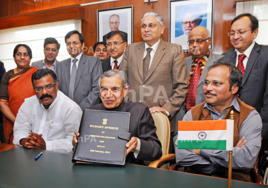 Union Minister for Railway, Pawan Kumar Bansal giving final touches to the Railway Budget 2013-14, in New Delhi on February 25, 2013. Minister of State for Railways, Adhir Ranjan Chowdhury, the Minister of State for Railways, KL Surya Prakash Reddy and the Chairman, Railway Board, Vinay Mittal are also seen in the picture. Photo Credit: Indian Photo Agency (InPA)