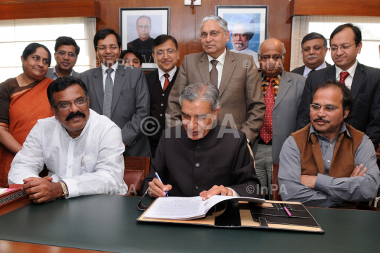 Union Minister for Railway, Pawan Kumar Bansal giving final touches to the Railway Budget 2013-14, in New Delhi on February 25, 2013. Minister of State for Railways, Adhir Ranjan Chowdhury, the Minister of State for Railways, KL Surya Prakash Reddy and the Chairman, Railway Board, Vinay Mittal are also seen in the picture. Photo Credit: Indian Photo Agency (InPA)