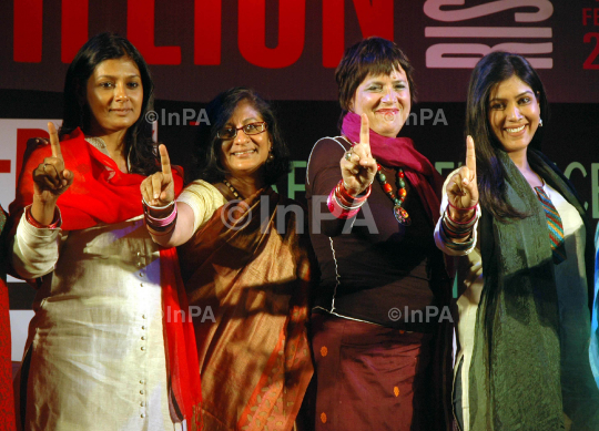 Bollywood actress Nandita Das, TV actress Sakshi Tanwar and American playwright Eve Ensler during the launch of One Billion Rising- India 2013 a global initiative to create awareness on violence against women in Mumbai, India, on Friday, Jan. 4, 2013. Photo Credit: Indian Photo Agency