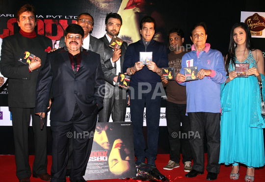 Veteran actor Jeetendra and Bollywood actor Akash Singh with actress Shilpa Anand, Kynal Singh, Ashok Bhadra, Akash, Jitendra, Kumar (Lyricist ) Sawan Kumar Tak during the music album launch of Film "Bloody Isshq" in Mumbai, India on January 17, 2013. Photo Credit: Indian Photo Agency