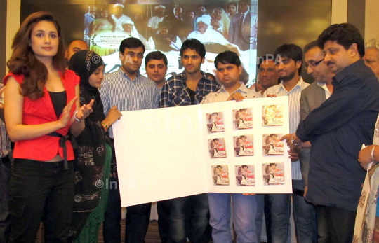 The star-cast of film 'KHAP'- Om Puri, Manoj Pahwa, Uvika Chaudhary, Sarrtaj Gill, director Ajai Sinha, Music Director Annujj Kappoo, Ex Member Administrative Reforms Commission, Haryana Prof. D.R. Chaudhary, Social Worker Jagmati Sangwan and a real life couple Abdul Hakim and Mehvish who survives from the Khap Panchayat during launch of the music of the film in Delhi on the 7th of July, 2011. Photo Credit: Indian Photo Agency