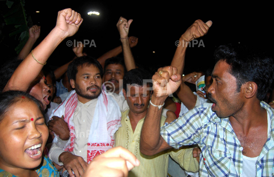 Krishak Mukti Sangram Samiti (KMSS) General Secreatary Akhil Gogoi raises slogan with his supporters after his release from police custody in Guwahati on Thursday 7th July 2011. Photo_ Ujjal Deb