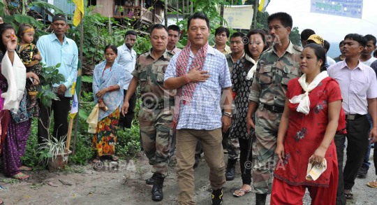 Panchayat election campaigning: Gorkhaland Territorial Administration (GTA) and Gorkha Janmukti Morcha (GJM) chief Bimal Gurung with the candidate and supporters on a rally during the election campaigning at Chamkdangi village near Siliguri in West Bengal, India on Saturday, July 06, 2013. Photo by Lila Shah/Indian Photo Agency (InPA)