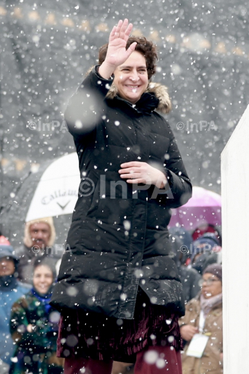 Congress leader Priyanka Gandhi Vadra during the closing ceremony of Bharat Jodo Yatra at Sher-i-Kashmir cricket stadium amid tight security and heavy snowfall in Srinagar, India on Jan. 30, 2023. Photo Credit: Indian photo agency (InPA)