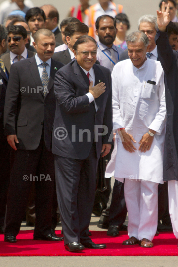 Pakistan President Asif Ali Zardari, waves while arriving at the Palam Airfield, in New Delhi, India, Sunday, April 8, 2012. Zardari arrived in India on a private trip Sunday. Parliamentary Affairs Minister Pawan Kumar Bansal is also seen. Photo Credit: Indian Photo Agency