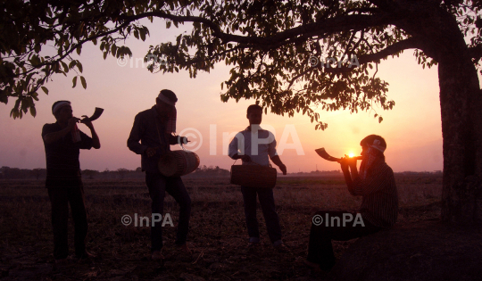 Youth plays 'Mohor Singor Pepa', (a pipe made from buffalo's horn) and 'Dhol' (Assamese traditional drum) under a tree on the eve of Rongali Bihu Celebrations in Sivasagar, Assam on April 11, 2012. Rongali Bihu is celebrated in the first month of the Assamese calendar and thus marks the advent of the Assamese New Year. This festival also coincides with the advent of the spring season in the state. Bihu Dance and Bihu Songs are the main features of this Bihu, which continue for a month throughout the state. Photo by Luit Chaliha/Indian Photo Agency