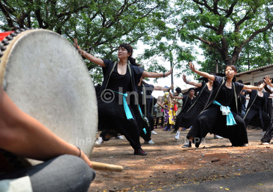 A Japanese girls waves perform during Japanese traditional festivals through the Mattancherry Street in Kochi, Kerala, India on April 19, 2012, as part of their 75th voyage of Peace Boat, which berthed on Thursday. Mikoshi' is a wooden object with 4meters long, 1 meter wide and 2 meter height. This was built the purpose of being carried all over the world for disaster relief and will be brought back to Japan with messages collected throughout the voyage. Photo by AS Satheesh/Indian Photo Agency