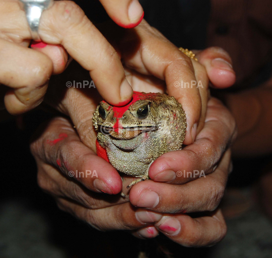 Farmers arranging a 'frog wedding' at a village in Sivasagar district of Assam, India on 16 June 2011. It is a popular belief that after this kind of wedding rain God pleases and adds to the delight of farmers. Photo by Luit Chaliha/ Indian Photo Agency (InPA)