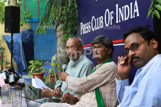 Dr. BD Sharma, former IAS, a social activist and Former Commissioner for SC & ST with Dr. Sunilam and GN Saibaba, General Secretary of the Revolutionary Democratic Front of India during a press conference at Press Club of India in New Delhi on April 25, 2012. Sharma was appointed as interlocutor by Maoists to negotiate the release of abducted Sukma District Collector, Alex Paul Menon, he asked the government to stop anti-Maoist operation-Operation Green Hunt. Photo Credit: Indian Photo Agency