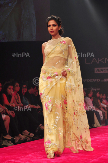 A model displays creation by fashion designer Bhairavi Jaikishan during the Lakme Fashion Week 2012 Winter/Festive, in Mumbai, India on August 6, 2012. Photo Credit: Indian Photo Agency