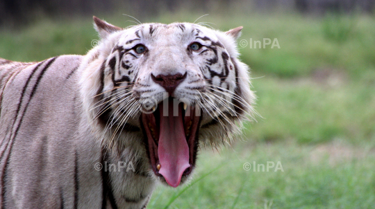 A 3-year-old white Bengal tiger named lucky yawns in Mahendra Chaudhary Zoological Park, Chhatbir zoo, 17 km from Chandigarh, Punjab, India on Aug 09, 2012. Photo by Kapil Sethi/Indian Photo Agency