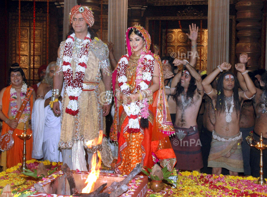 Bollywood Actors Mohit Raina as Lord Shiva and Sonarika Bharodia as Parvati during the wedding ceremony of serial ''Devon ke Dev - Mahadev' which will be telecast on 12 August, at Naigaon,Thane in Mumbai, on Aug 10, 2012. Photo Credit: Indian Photo Agency