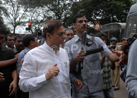 Mumbai Aug. 11 :- Angry anctivist burned the media as well as police & other vehicle during protest rally at out side C S T station & Azad maidan in Mumbai. In pic Samajwadi Party leader Abu Hasim azmi arrive after incident. The demonstrators were protesting against religious violence in Assam and Myanmar. A number of police and media vehicles were set on fire by the angry mob. The police had to open fire in the air and lathi-charge the mob to bring the situation under control. Photo by Sachin Halde/Indian Photo Agency