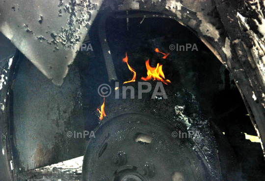 A torched vehicle on the road which was torched by the protestor at Bhatkuchi under Kamrup district as a part of ethnic violence in BTAD area and burn of nano vehicle at Gandhibari under Baska district yesterday at Rangia on Thursday 16th August 2012.Curfew had been imposed at Rangia. Photo by Dasarath Deka/Indian Photo Agency