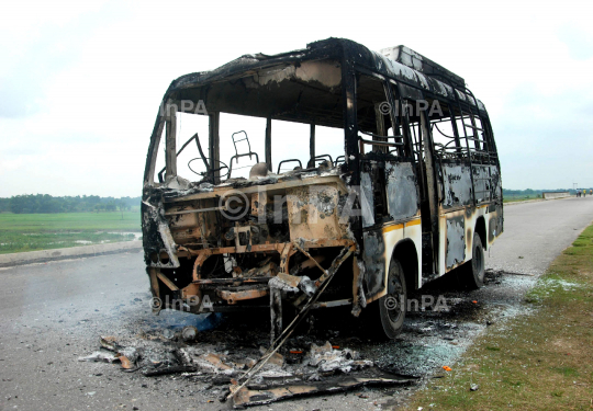 A torched vehicle on the road which was torched by the protestor at Bhatkuchi under Kamrup district as a part of ethnic violence in BTAD area and burn of nano vehicle at Gandhibari under Baska district yesterday at Rangia on Thursday 16th August 2012.Curfew had been imposed at Rangia. Photo by Dasarath Deka/Indian Photo Agency