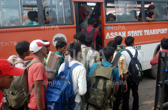 Students and youth from the North East boarding a bus after they arrived at Guwahati Railway Station through a special train from Bangalore for the fear of their life due to ethnic violence in Guwahati on Saturday 18th August 2012. The government on Friday banned bulk SMS and MMS messages for 15 days in view of the exodus of people from the northeast from cities like Bangalore, Pune and Hyderabad following rumors that they would be attacked. Photo by Dasarath Deka/Indian Photo Agency