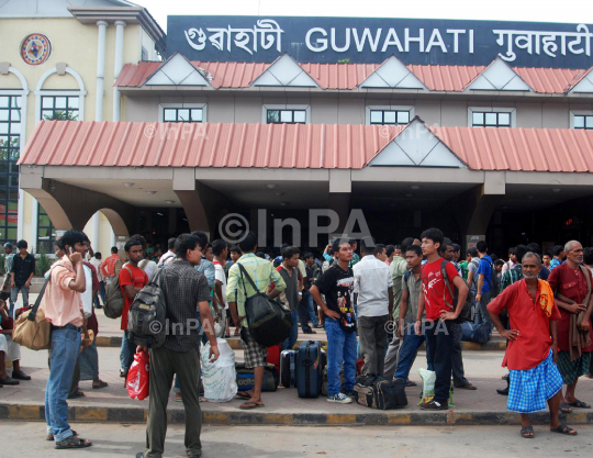 Youth and students from North East state reach Guwahati Railway Station in a special train from Bangalore under tight security for the fear of their life due to ethnic violence in Guwahati on Saturday 18th August 2012. The government on Friday banned bulk SMS and MMS messages for 15 days in view of the exodus of people from the northeast from cities like Bangalore, Pune and Hyderabad following rumors that they would be attacked. Photo by Dasarath Deka/Indian Photo Agency