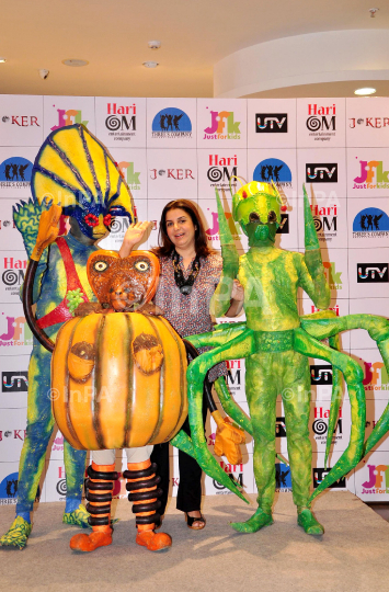 Bollywood actress and choreographer Farah Khan with the aliens during the promotion of her upcoming film "Joker" in Mumbai on August 24, 2012. Photo Credit: Indian Photo Agency