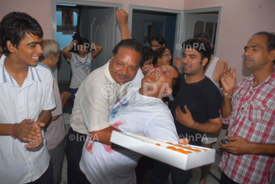 Kewal Passi, father of Indian U19 cricketer Kamal Passi, celebrate with their relatives, after India won the U19 cricket World Cup, in Amritsar on Sunday, August 26, 2012. Photo By Dheeraj Sharma/Indian Photo Agency