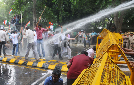 Supporters of veteran Indian social activist Anna Hazare shout as they are hit with a police water cannon during a protest against corruption near the residence of Chief of India's ruling Congress party Sonia Gandhi in New Delhi August 26, 2012. Photo Credit: Indian Photo Agency