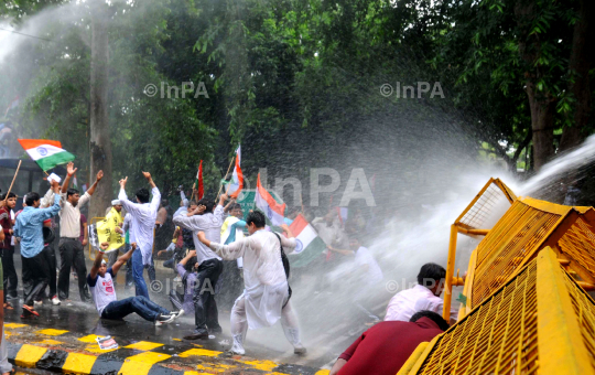 Supporters of veteran Indian social activist Anna Hazare shout as they are hit with a police water cannon during a protest against corruption near the residence of Chief of India's ruling Congress party Sonia Gandhi in New Delhi August 26, 2012. Photo Credit: Indian Photo Agency