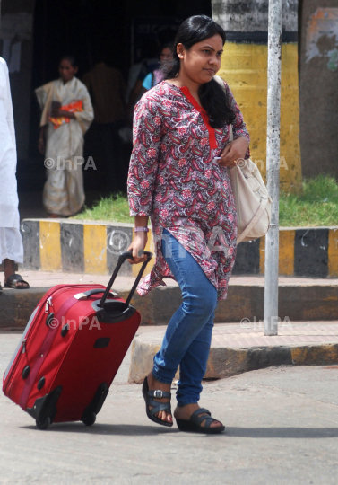 A girl walks with her belongings during the 12 hours Assam bandh called by Bajrang Dal as a protest against the BTAD ethnic violence and in demand for the arrest of AIUDF chief and MP Baduruddin Ajmal for his alleged involvement in ethnic violence in Assam in Guwahati on Monday 27th August 2012. Photo by Dasarath Deka/Indian Photo Agency