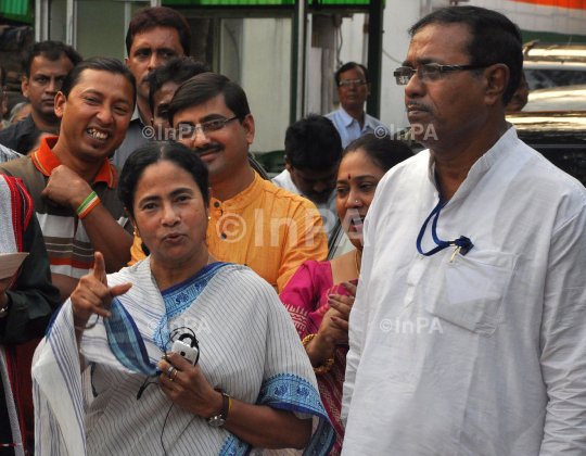 TMC chief and West Bengal Chief Minister Mamata Banerjee along with wining Party Candidates Subrata Bakshi greet after win in the bye-election in south Kolkata, West Bengal on 04/12/2011. Trinamool Congress candidate Subroto Bakshi, minister for PWD and Transport, polled 5,16,761 votes while his nearest rival Ritobroto Banerjee of CPI(M) got 2,86,662 votes. Photo Credit: Indian Photo Agency
