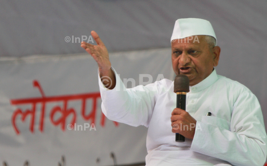 Indian anti-corruption activist Anna Hazare, speaks durinh his day long fast, in New Delhi, India, Sunday, Dec. 11, 2011. Indian anti-corruption crusader Anna Hazare, whose campaign in August attracted massive public support, held a one-day fast December 11 demanding the government do more to crack down on crooked officials. Hazare returned to New Delhi for a one-day symbolic fast to protest against the government's draft of a new anti-corruption law, which he said was "toothless" legislation that exempted many key officials. Photo Credit: Indian Photo Agency