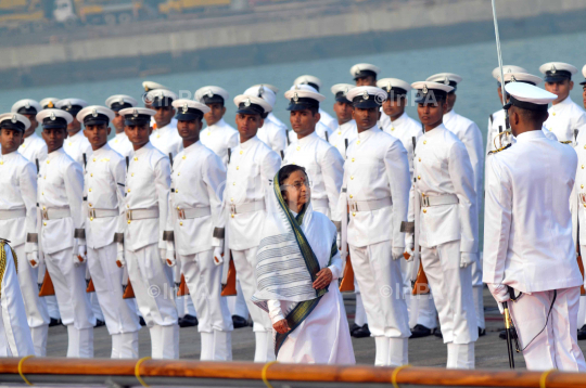 Indian President, Pratibha Devisingh Patil inspecting the Guard of Honour, during the 10th President's Fleet Review (PFR) in Mumbai, on December 20, 2011. A total of 81 ships participated in the event which includes fly past by 44 aircraft from Navy and Coast Guard. Photo by Sachin Halde/Indian Photo Agency