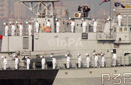 Indian Navy personnel salute from the deck of an Indian naval vessel during the Presidents Fleet Review (PFR) in the Arabian Sea off the coast of Mumbai, India, Tuesday, Dec. 20, 2011. A PFR is conducted once in the tenure of a President who is also the supreme Commander of the armed forces to showcase the naval prowess and its strike capabilities. Photo by Sachin Halde/Indian Photo Agency