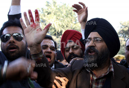 A advocate showing his blooded hand in Jammu protesting against government decision out side the Deputy Chief minister Tarachand residence at Jammu in Jammu and Kashmir on 22/12/2011. Photo Credit: Indian Photo Agency