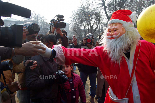 Santa Claus distributing sweets at Church on Christmas at Srinagar in Jammu and Kashmir on Sunday, 25/12/2011. Photo by Tariq Mir/Indian Photo Agency
