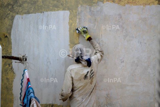 Whitewash: An Indian labour paints a wall of house in New Delhi on February 08, 2012. Photo Credit: Indian Photo Agency