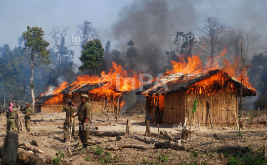 Forest rangers torch houses at Hinoto village during an eviction drive in Intangki National Park of Indiaís north eastern state of Nagaland on February 21, 2012. The Forest department destroyed about 53 illegally settlements built in the National Park. The Intangki National Park covers an area of 20202 hectares. Photo by Caisii Mao/Indian Photo Agency