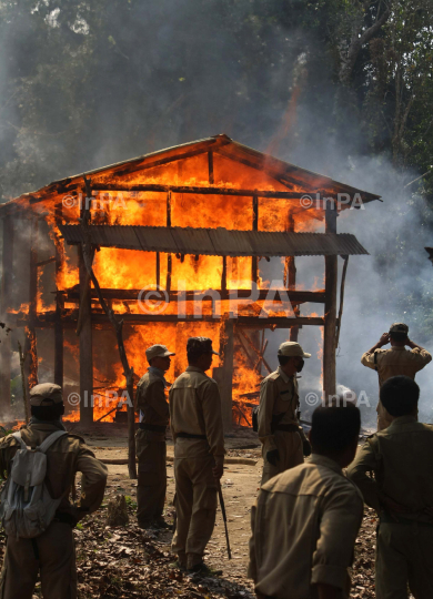 Forest rangers torch houses at Hinoto village during an eviction drive in Intangki National Park of Indiaís north eastern state of Nagaland on February 21, 2012. The Forest department destroyed about 53 illegally settlements built in the National Park. The Intangki National Park covers an area of 20202 hectares. Photo by Caisii Mao/Indian Photo Agency