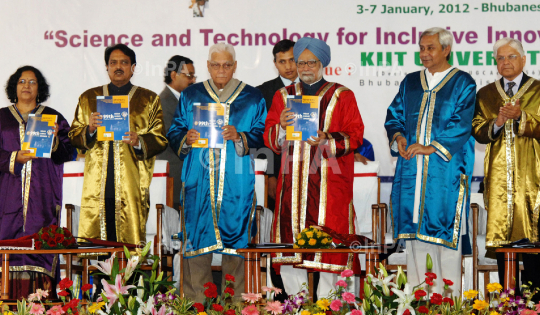 Indian Prime Minister, Dr Manmohan Singh releasing a book at the 99th Annual Session of the Indian Science Congress, at Bhubaneswar, in Odisha on January 03, 2012. Governor of Odisha, MC Bhandare, Union Minister for Science and Technology and Earth Sciences, Vilasrao Deshmukh, Chief Minister of Odisha, Naveen Patnaik and the Minister of State for Planning, Science & Technology and Earth Sciences, Dr Ashwani Kumar are also seen. Photo Credit: Indian Photo Agency