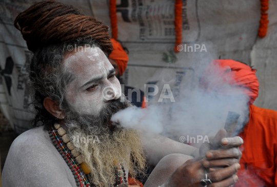 A Hindu holy man (Sadhu) enjoying "Ganja"(Tobacco) at a Transit Camp of Gangasagar at Babughat in Kolkata, West Bengal on 08/01/2012. Photo Credit: Indian Photo Agency