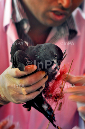 Doctor shows a bird, injured pigeon with thread (Manja) at camp organised by Shree Jain Alert Group Bhayandar "save the Bird life" at Bhayandar Camp, in Mumbai on 14/01/2012. Glass-powder-coated thread (maanjha) using for flying kites CUT the feathers of birds. Photo by Sachin Halde/Indian Photo Agency