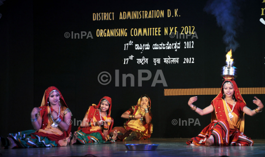 Folk artist from Rajasthan performing their traditional Rajasthani Folk Dance at the 17th National Youth Festival to mark 150th birth anniversary of Swami Vivekananda in Mangalore on 15/01/2012. Photo by RK Bhat/Indian Photo Agency