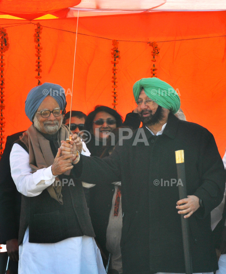 Indian Prime Minister Manmohan Singh, brandishes a sword presented to him from former Chief Minister of Punjab state, Captain Amrinder Singh, right, after addressing an election rally in Amritsar, India, Saturday, Jan. 21, 2012. Photo Credit: Indian Photo Agency