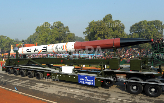 Agni 4 Missile passes through the Rajpath during the final rehearsal of Republic Day parade in New Delhi, India, Monday, Jan. 23, 2012. India will celebrate its 63rd Republic Day on January 26 with a large military parade, with Thailand's Prime Minister Yingluck Shinawatra being the chief guest of the event. Photo Credit: Indian Photo Agency
