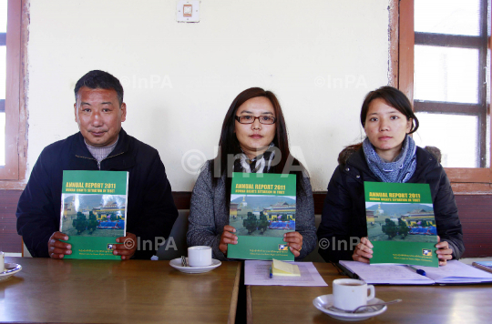 Tsering Tsomo (centre), executive Director, TCHRD ( tibetan centre for hunman rights and emocracy) with other members releasing the report on 2011 Annual Report of Human Rights situation in tibet, at Dharamshala in Himachal Pradesh, India, Jan. 23, 2011. Photo by Shailesh Bhatnagar/Indian Photo Agency