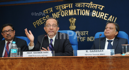 Chief Economic Adviser, Dr Kaushik Basu addressing a Press Conference on the subject "the outlook of the Indian economy and comment on a new measure of comparative sovereign ratings", in New Delhi on January 31, 2012. Principal Economic Adviser, Deepak Dasgupta and the Director General, PIB, K Ganesan are also seen. Photo Credit: Indian Photo Agency