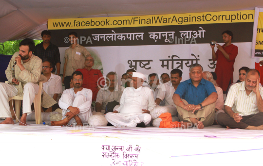 Social activist and Team Anna member Gopal Rai, speaks as Anti-corruption activist Anna Hazare looks during the last day of his hunger strike for a strong Lokpal Bill in New Delhi on August 03, 2012. With his latest anti-corruption protest failing to ignite India's middle class, activist Anna Hazare ended a six-day hunger strike Friday with a glass of juice served to him by India's former army chief. His aide also announced that the group would enter politics. , former army chief VK Singh, Arvind Kejriwal, Manish Sisodia, Shanti Bhushan, Prashant Bhushan, Sanjay Singh, Shazia Ilmi are also in the picture. Photo by Shweta/Indian Photo Agency