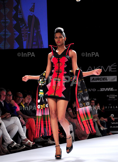 A model displays creation by designer Asa Kazingmei at Next Generation show during Lakme Fashion Week in Mumbai, India, Friday, Aug. 3, 2012. Photo Credit: Indian Photo Agency