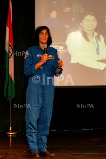 A file photo of American Astronaut of Indian origin Sunita Williams interacts with school children in New Delhi, India, on Oct. 1, 2007. 46-year-old Williams is scheduled to take off from the Baikonur Cosmodrome in Kazakhstan at 8.40 am tomorrow on July 15, 2012. She spent a record six months at International Space Station in 2006. Photo Credit: Indian Photo Agency