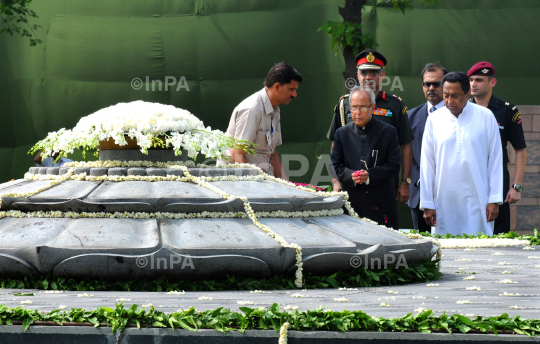 India's newly elected President Pranab Mukherjee paying floral tributes at the Samadhi of the former Prime Minister Late Rajiv Gandhi, at Vir Bhumi, in New Delhi July 25, 2012. Mukherjee, former finance minister and senior leader of the ruling Congress party, has been elected as India's 13th president on Sunday. Photo Credit: Indian Photo Agency